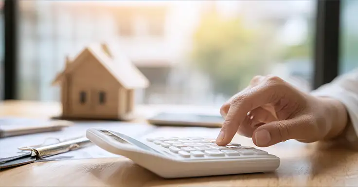 Hand tippt auf Taschenrechner auf einem Schreibtisch